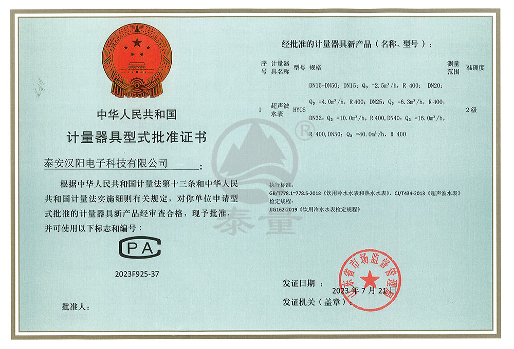 超聲波水表型評證書